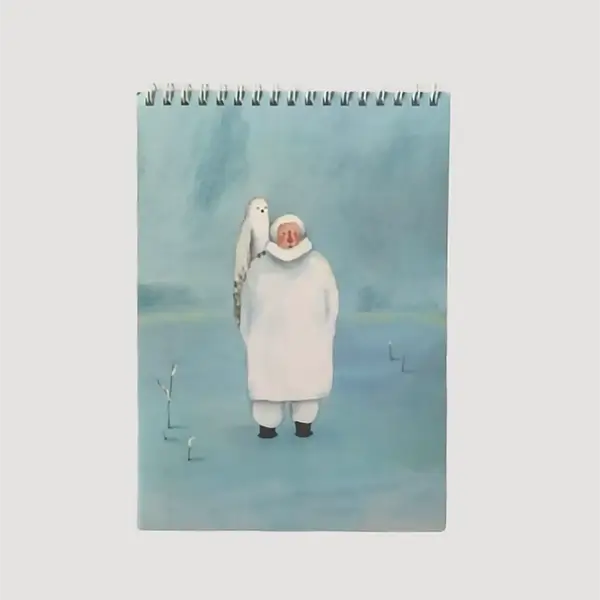 Ce bloc-notes met en lumière une scène poétique : l’homme de glace partageant sa présence avec une chouette majestueuse.